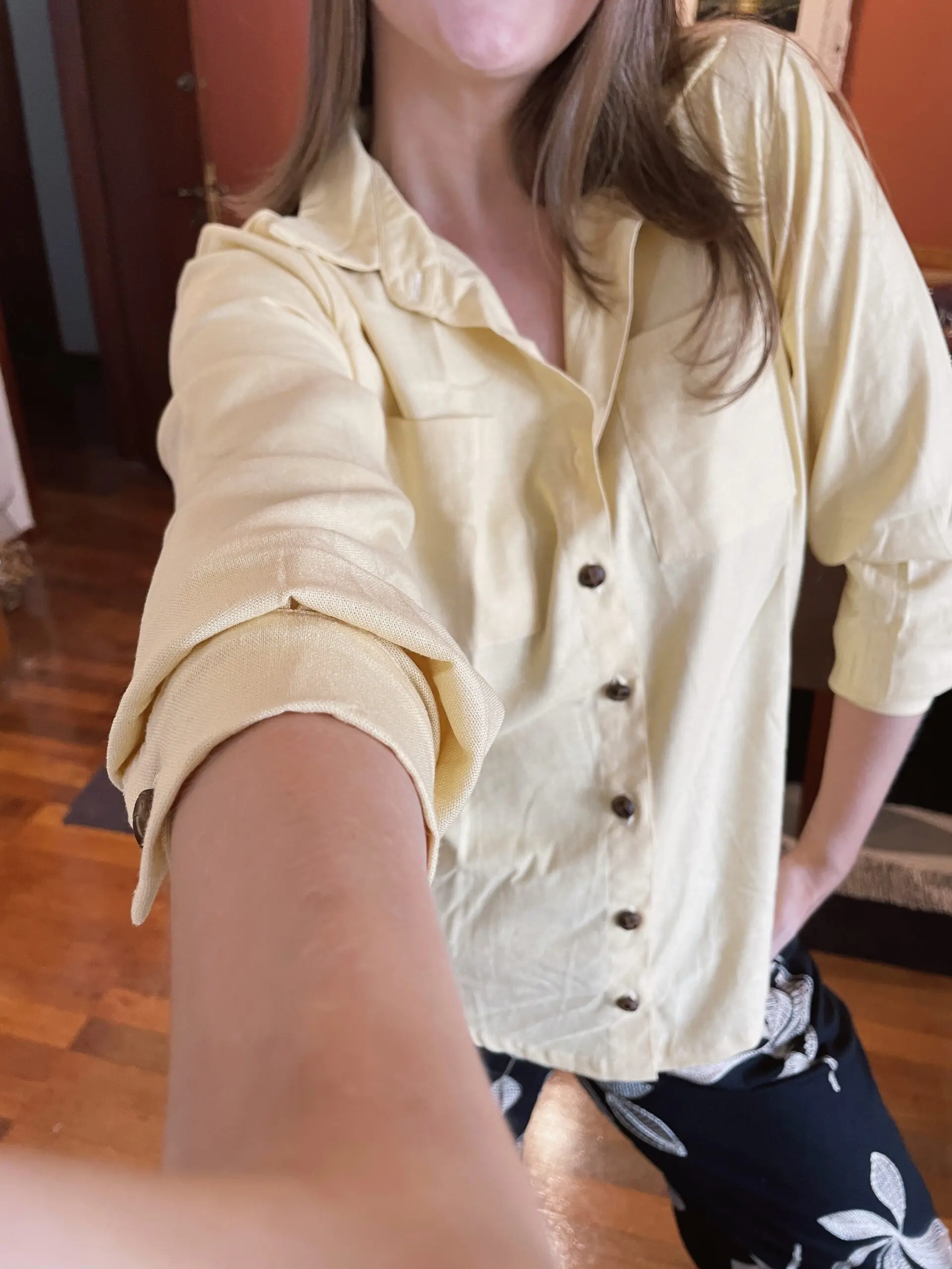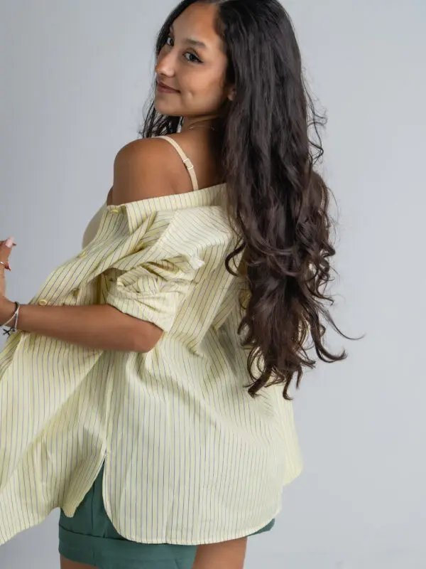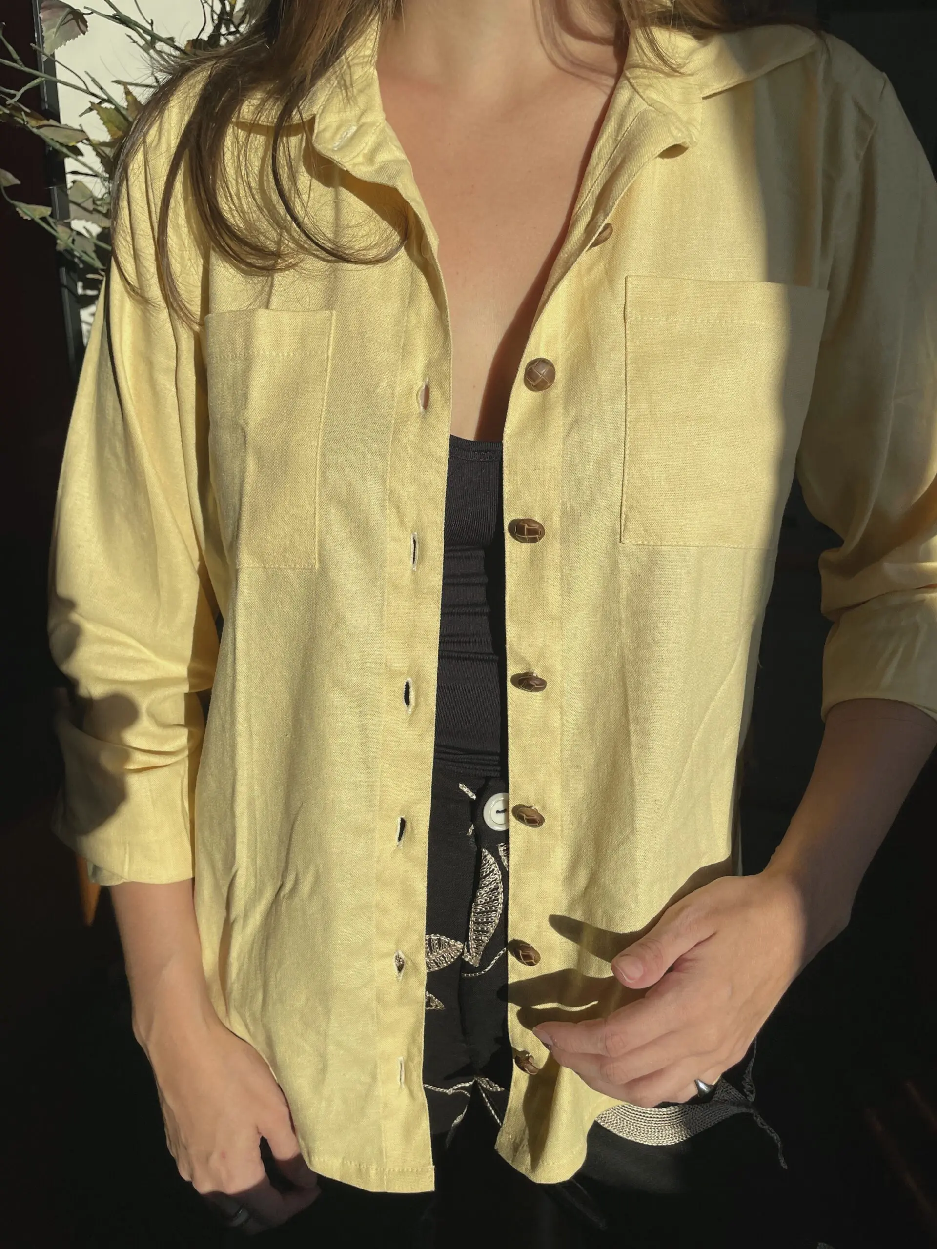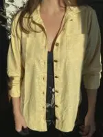 Nossa camisa de linho amarelo manteiga é aquele toque de cor que levanta qualquer look. Leve, estilosa e com modelagem soltinha, ela tem dois bolsos frontais e uma parte de trás levemente arredondada que garante um caimento lindo!