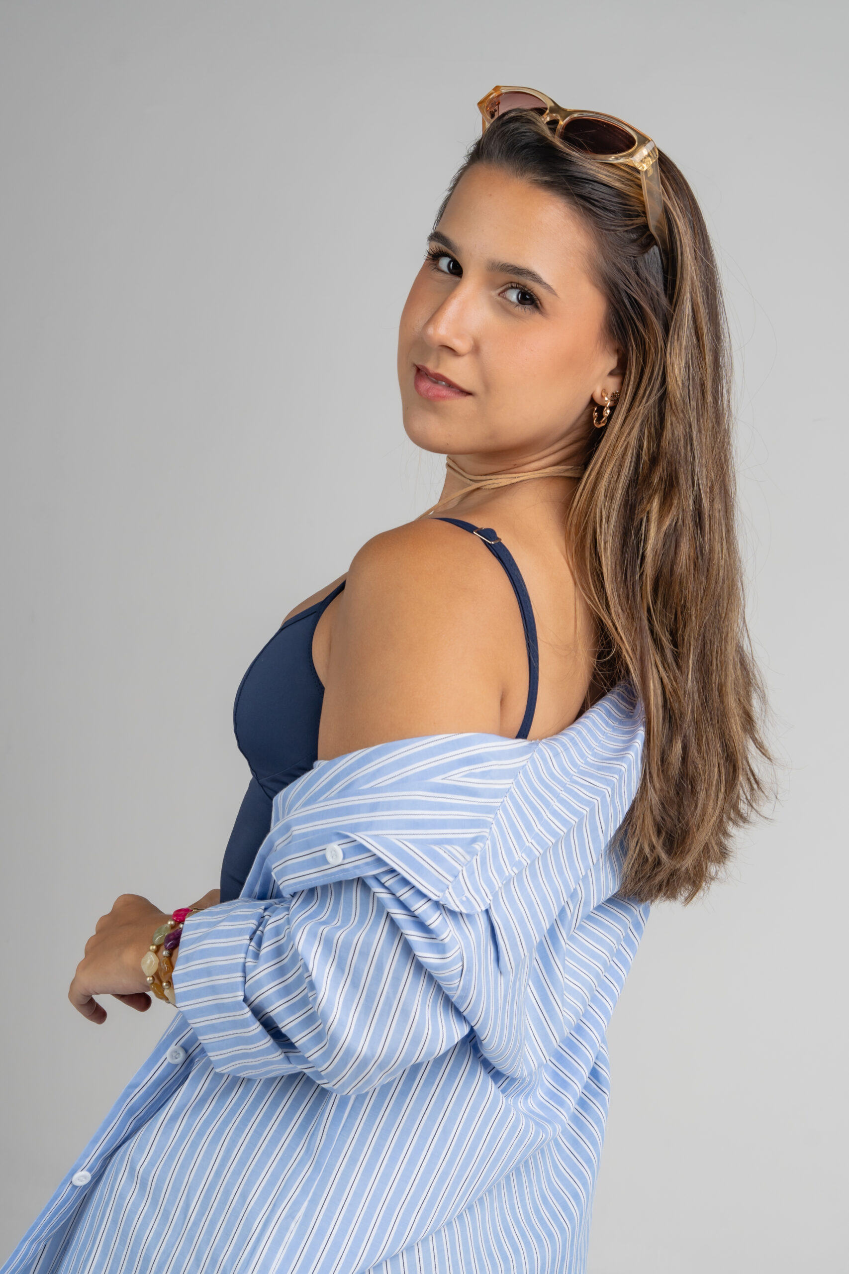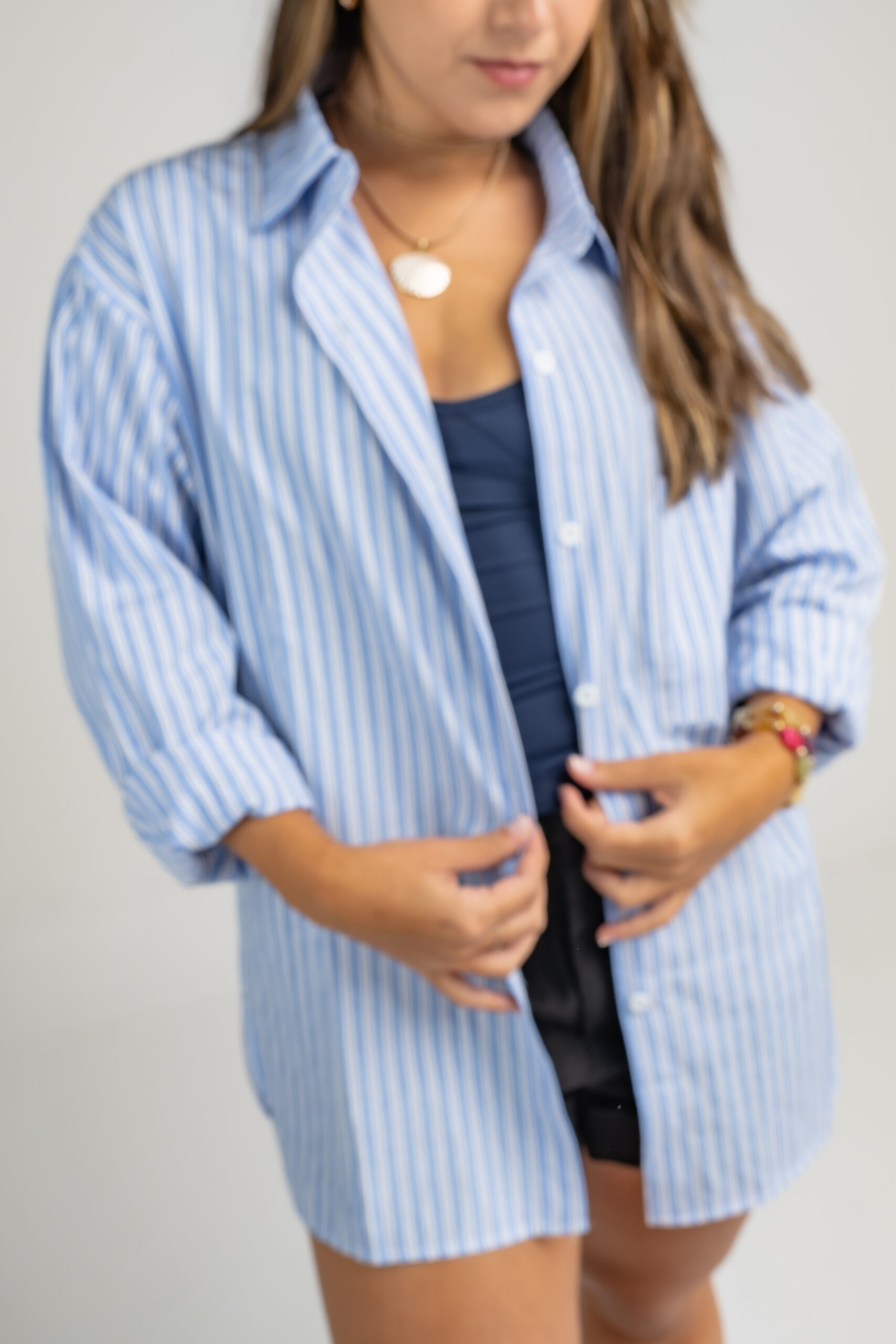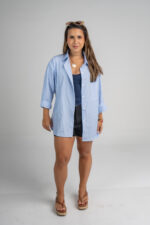 A camisa azul listrada traz uma proposta clássica e atemporal, com modelagem oversized que garante conforto e movimento. Feita em tecido leve e macio, ela possui listras finas em branco que criam um visual clean e sofisticado.
