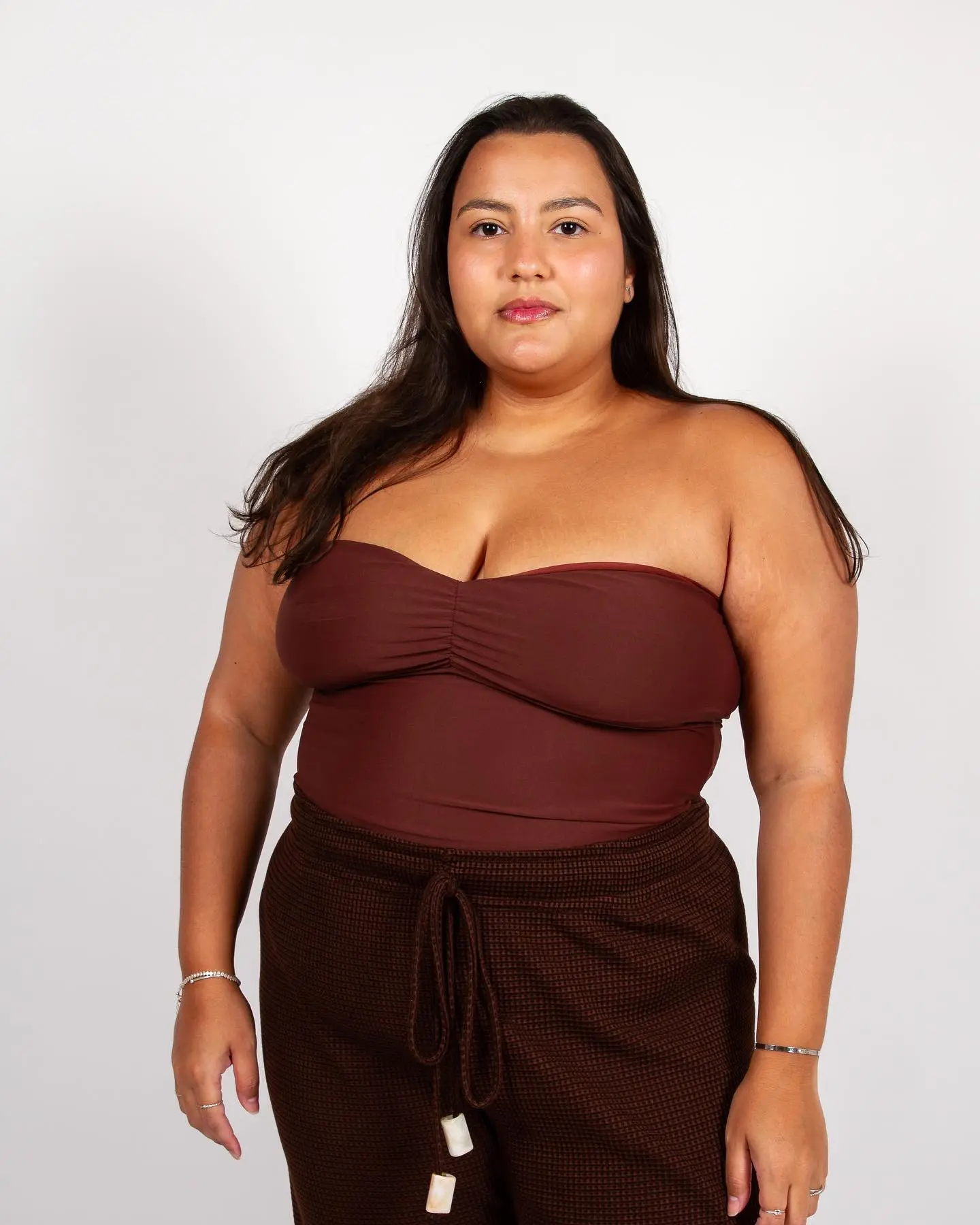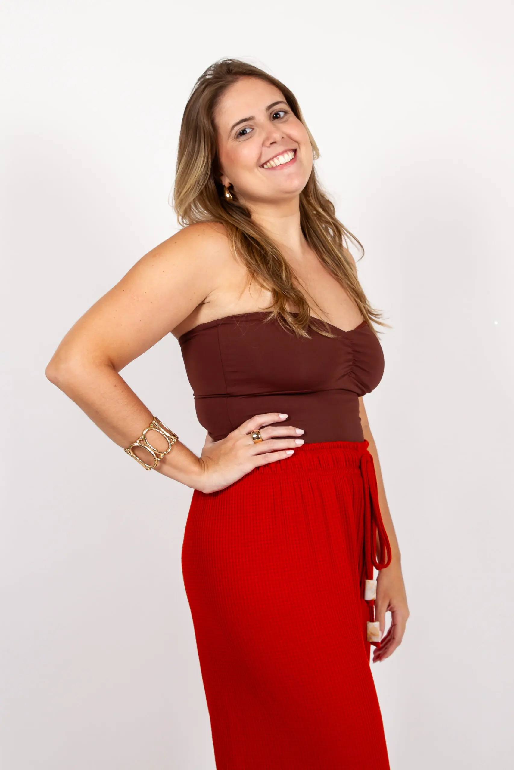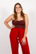 Carol usa tamanho GG (está com cropped Sevilha marrom e calça marrom)