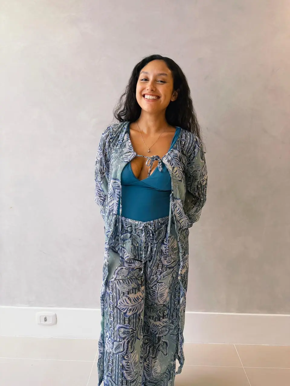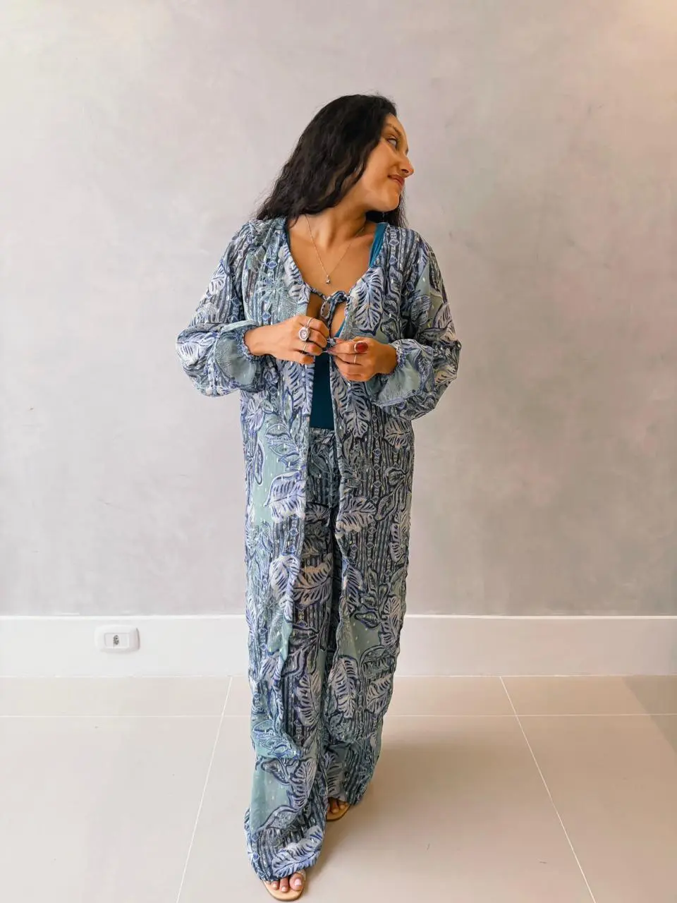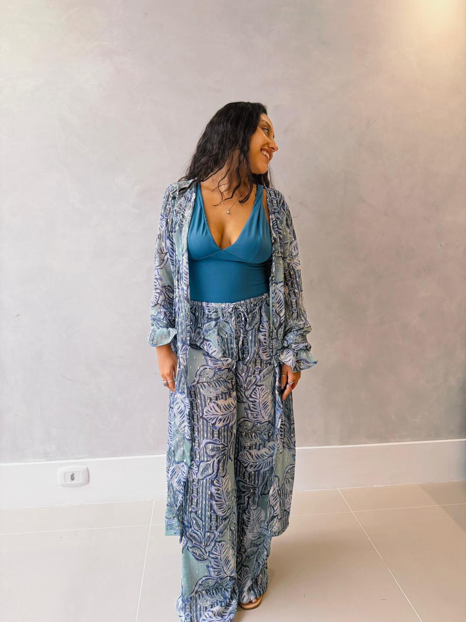 O tecido leve garante movimento, conforto e frescor, enquanto a estampa adiciona um toque sofisticado e atemporal ao look. Ideal para usar com a calça coordenada ou combinar com peças neutras do dia a dia.