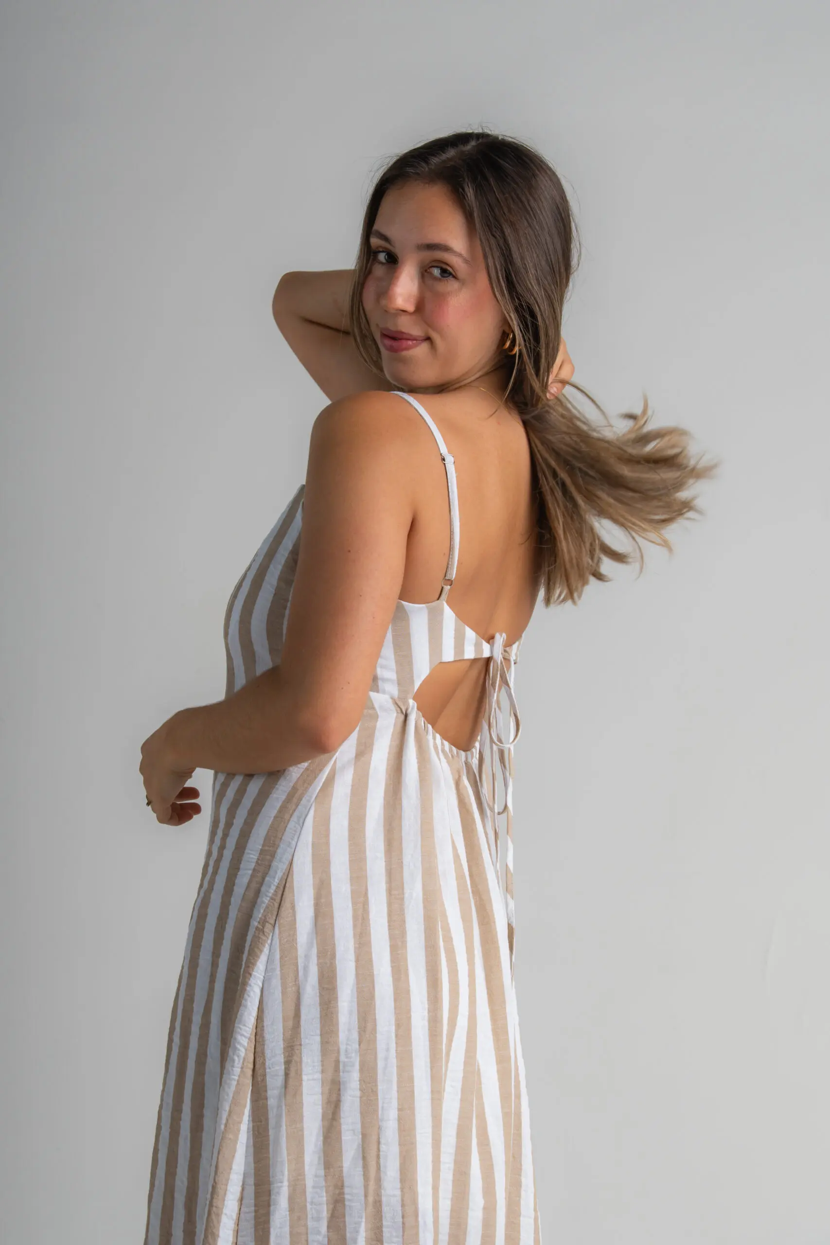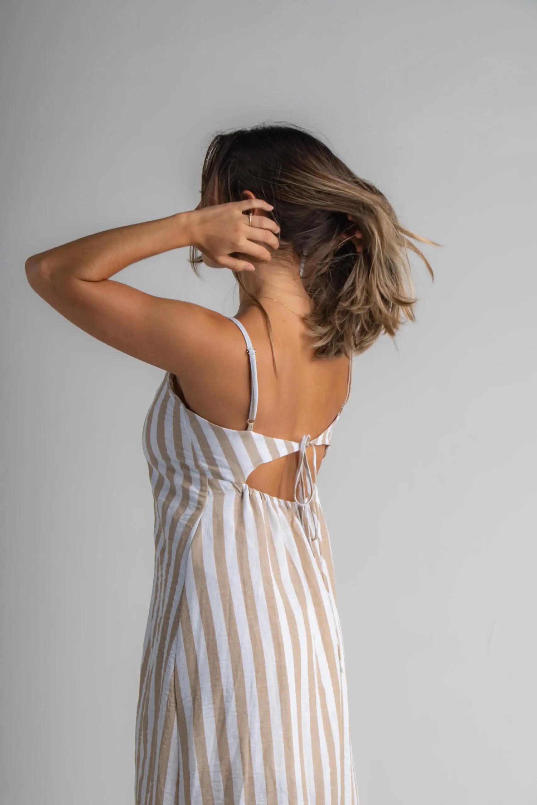A parte de trás conta com um decote delicado e moderno, finalizado com amarração que adiciona charme e permite o ajuste ideal ao corpo.